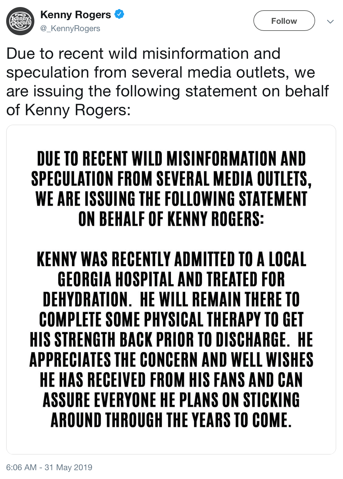 Singer and actor Kenny Rogers was admitted to a hospital, where he was treated for dehydration, according to an announcement on his Twitter account. You can see the announcement below.