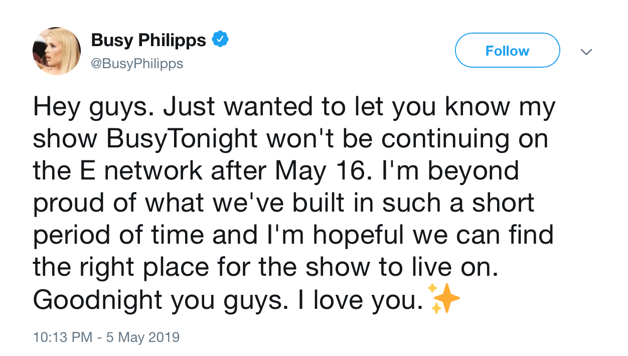 Show host Busy Philipps broke the news late Sunday on social media — you can see a tweet below on the subject.