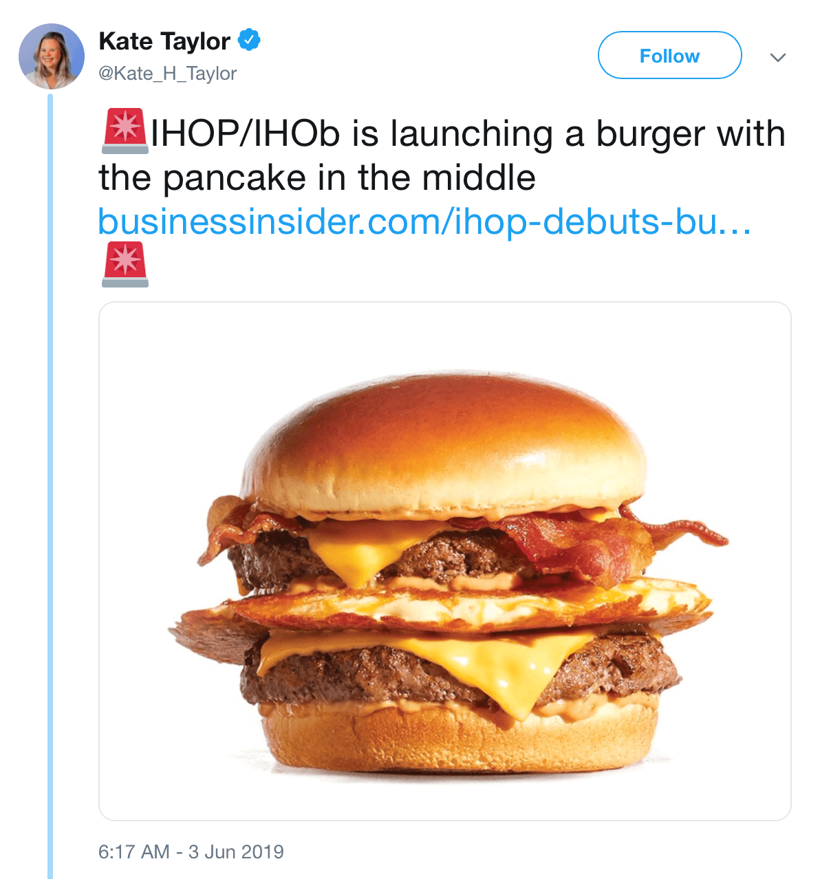 According to Business Insider, IHOP President Darren Rebelez credits the chain’s customers with the idea. Said Rebelez: “People kept asking us, ‘When are you going to have a burger with pancakes?'”