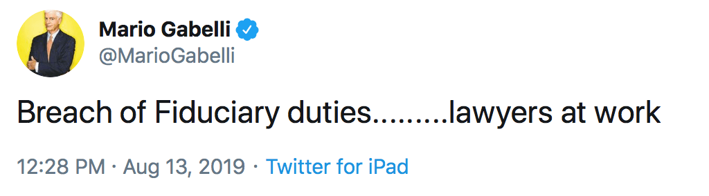The largest independent holder of voting stock in CBS Corp. and Viacom apparently was less than enthusiastic about news this week that the two companies were merging. Mario Gabelli sent out a tweet Tuesday afternoon, which you can see below, saying simply: “Breach of Fiduciary duties………lawyers at work.”