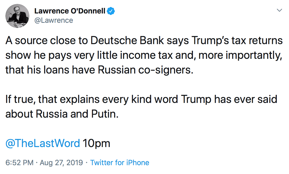 THR quotes Harder’s demand letter saying: “The Program and Tweet make the false and defamatory statements that ‘Russian oligarchs’ co-signed loans provided to Mr. Trump by Deutsche Bank, and described these ‘co-signers’ as ‘Russian billionaires close to Vladimir Putin.’”