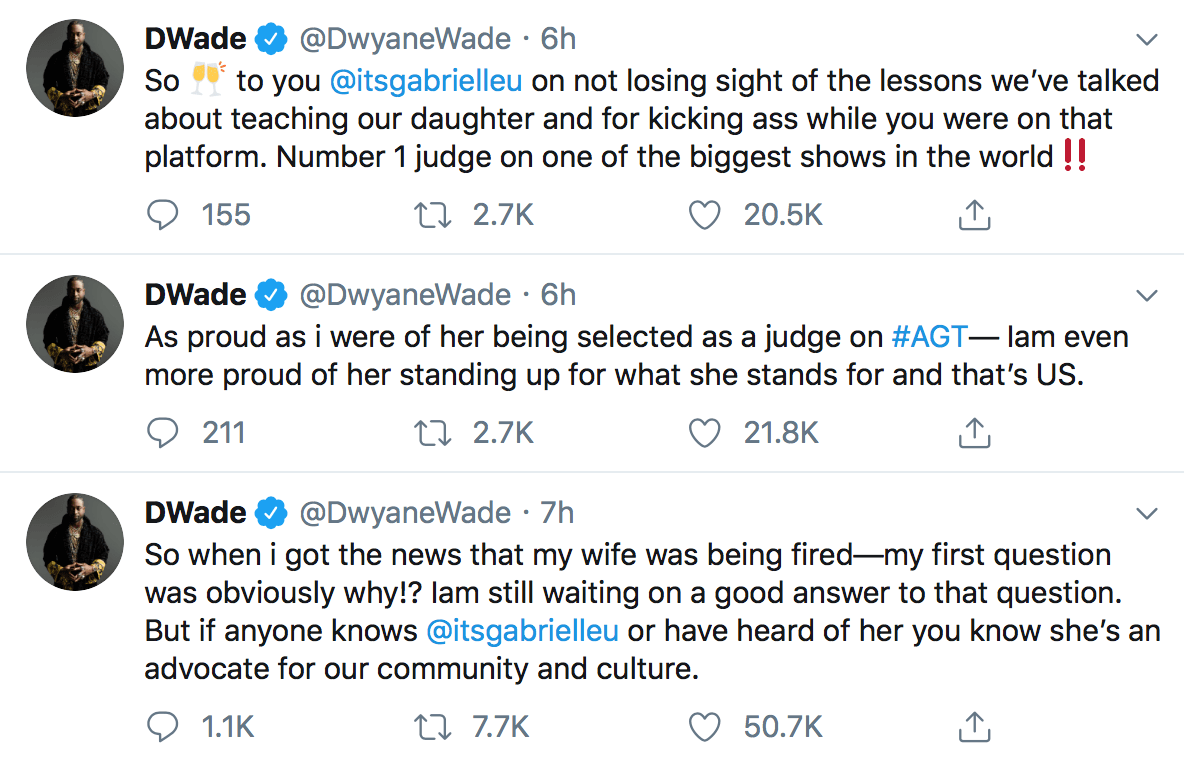 “When i got the news that my wife was being fired — my first question was obviously why!?,” Wade wrote. “Iam still waiting on a good answer to that question. But if anyone knows @itsgabrielleu or have heard of her you know she’s an advocate for our community and culture.”