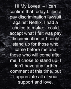 The report quotes the lawsuit stating: “Mo’Nique objected to Netflix’s discriminatory pay offer, pointed out how it was discriminatory and asked Netflix to do the right thing by negotiating fair pay with her. In response, Netflix did the opposite. It dug its heels in the ground, refused to negotiate fairly and stood behind its discriminatory offer.”